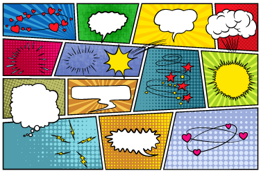 Panel: Also called a “frame.” A panel is a box with a drawing inside of it. Warning to foodies: when all the panels are the same size, we get a “waffle.” Some comic books, like mangas, have asymmetrical panels; others don’t have any panels at all, like some graphic novels.