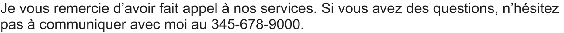 Je vous remercie d’avoir fait appel à nos services. Si vous avez des questions, n’hésitez pas à communiquer avec moi au 345-678-9000.