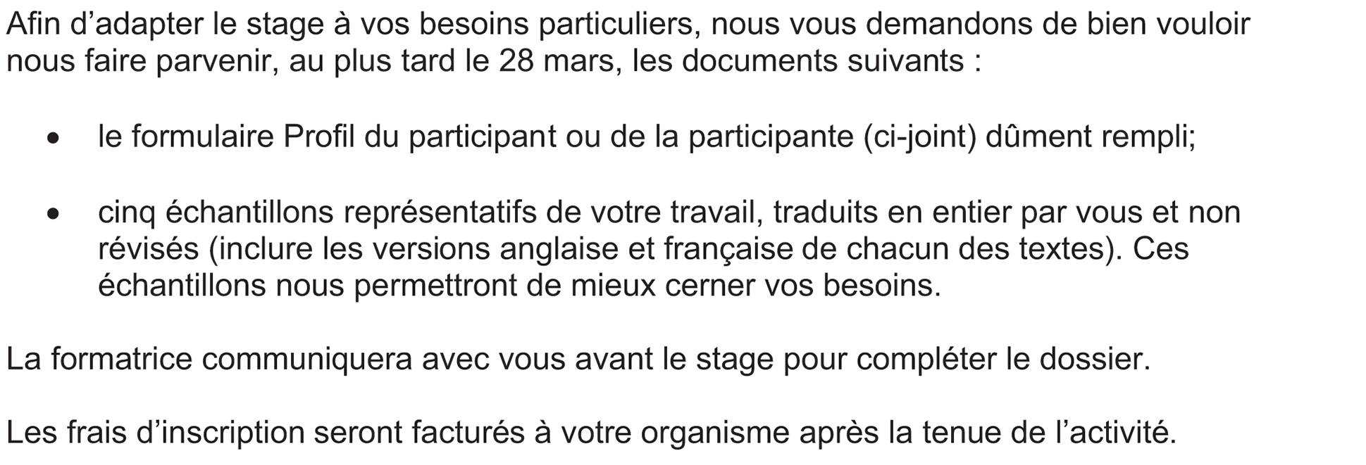 Afin d’adapter le stage à vos besoins particuliers, nous vous demandons de bien vouloir nous faire parvenir, au plus tard le 28 mars, les documents suivants :