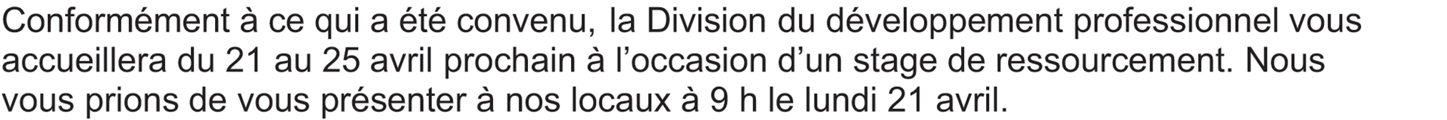 Conformément à ce qui a été convenu, la Division du développement professionnel vous accueillera du 21 au 25 avril prochain à l’occasion d’un stage de ressourcement. Nous vous prions de vous présenter à nos locaux à 9 h le lundi 21 avril.